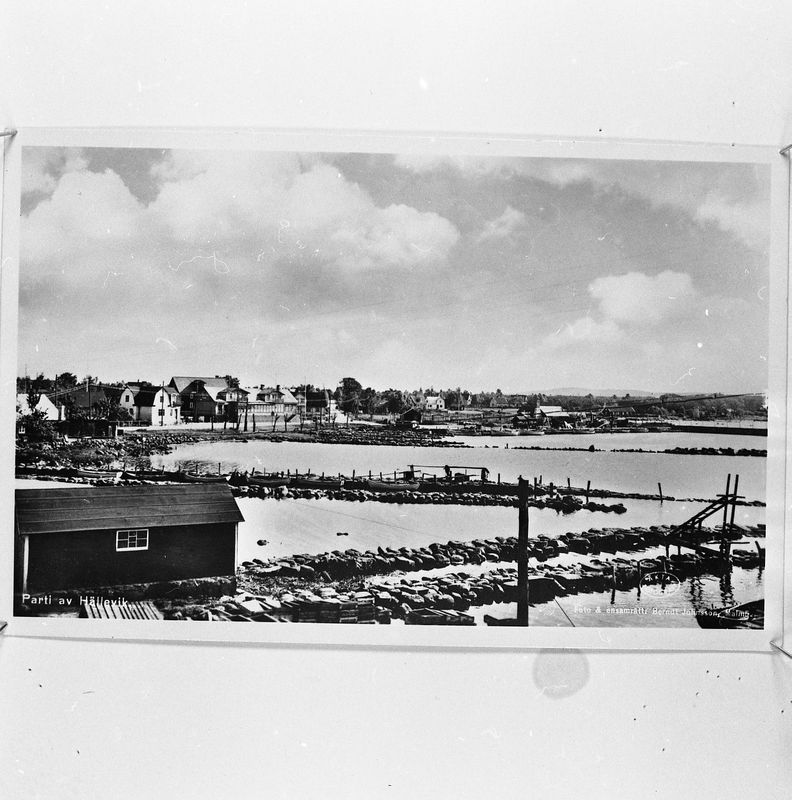 Foto från början av 1940-talet. Hamnparti. Till höger en hejarställning för ålbottengarn.