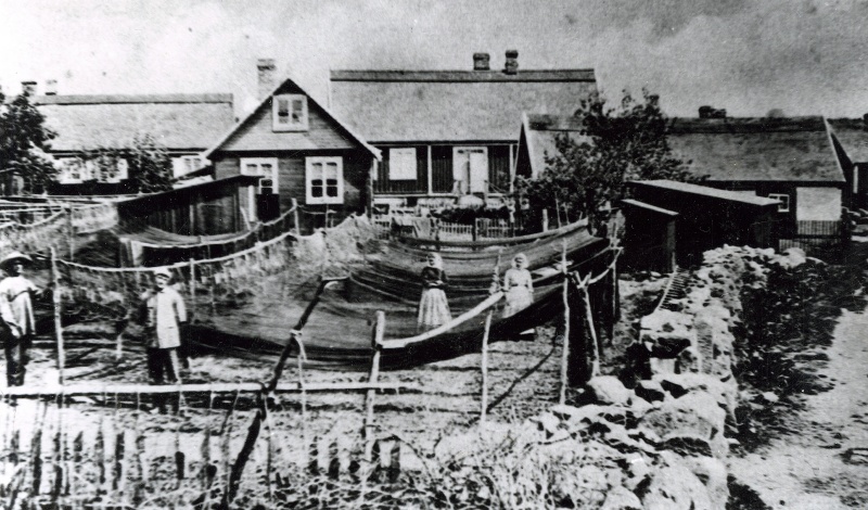 I en "garnahave" på Hällevik omkring 1910. Husen är från vänster nuvarande Styrmansvägen 2, Strandvägen 18, Strandvägen 16 och Strandvägen 18 A. Från vänster: Knut Bengtsson (född 1855), Elias "Sebäck" Bengtsson (född 1884), Karna Fogelström (född 1850), Augusta Fogelström (född 1870, svärdotter till Karna Fogelström).